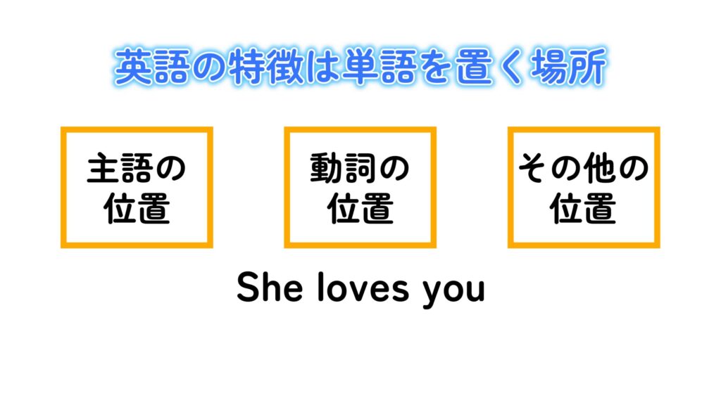 そして、主語の位置、動詞の位置、目的語の位置など、単語を置く場所によって、文章の意味が決まってくるということです。