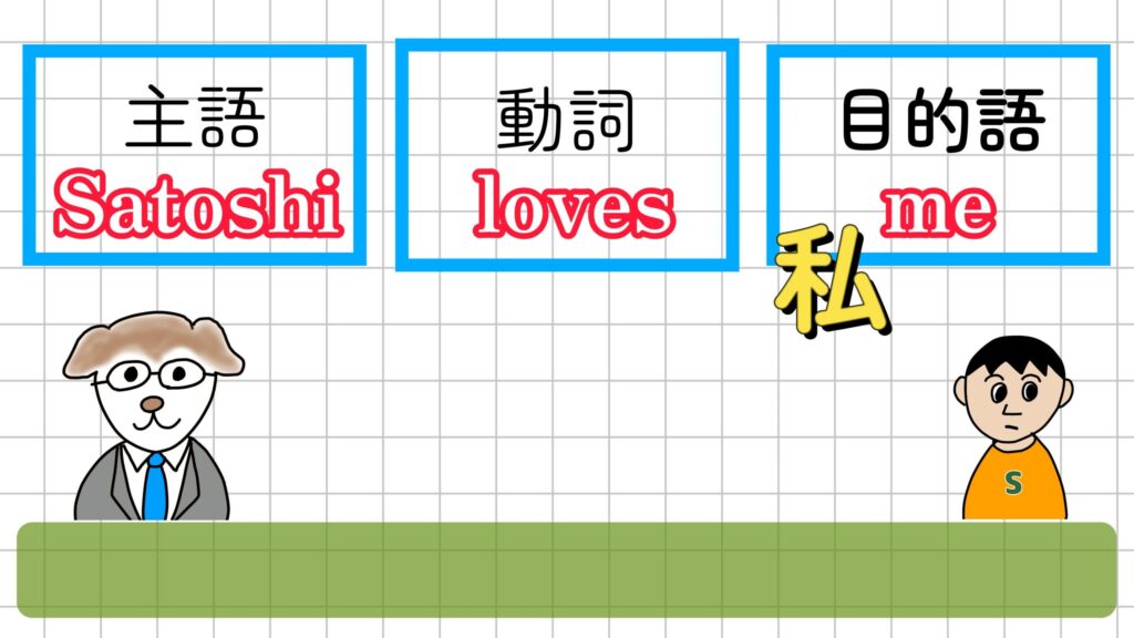 そして、「loves」は、主語の後ろに位置しています。この位置にある動詞というものは、文章の中で主語が行う動作や状態を表します。 そして、「you」は、動詞の後ろに位置しています。この位置にあるものを目的語といいます。日本語では「~を」とか、「~に」と訳され、文章の中で動詞の「loves」、つまり「愛している」という言葉の対象になっています。