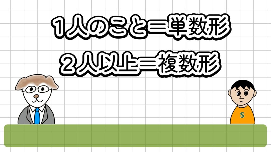 私やあなた、彼や彼女は1人のことを言っているので「単数形」というんだよ。 彼らとか、私たち、あなたたちというのは、2人以上だから、「複数形」というんだよ。