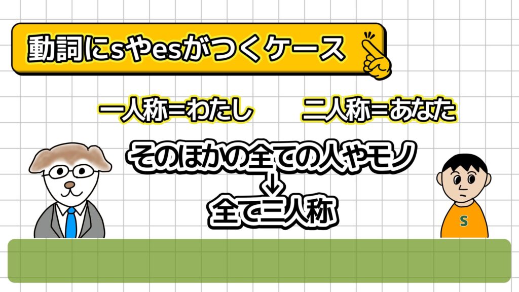 昔の英語は人称ごとに動詞の形が変化していましたが、長い年月をかけて簡略化され、3人称単数現在の「-s」だけが残ったとされています。だけど、人称という言葉自体が難しいから、次のように理解するといいよ。